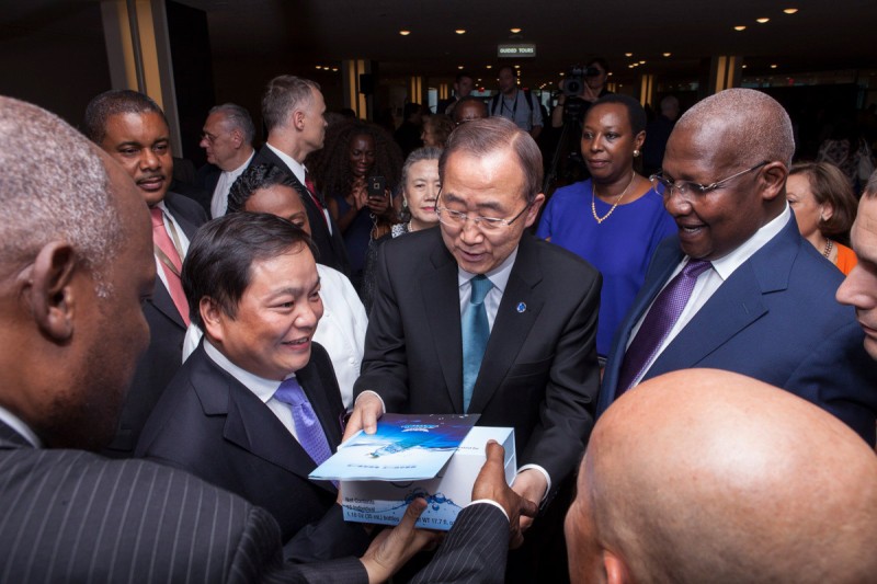 After agreeing to the deal, Yan, Zhou, and an entourage traveled to New York. On June 29, 2015, they had a meeting and lunch with Kutesa during a high-level U.N. meeting on climate change. The following day, Kutesa’s staffers helped Yan get a rushed series of photos with Ban on the sidelines of an art event in which the bemused-looking former secretary-general can be seen holding a box of Yan and Zhou’s miracle water.