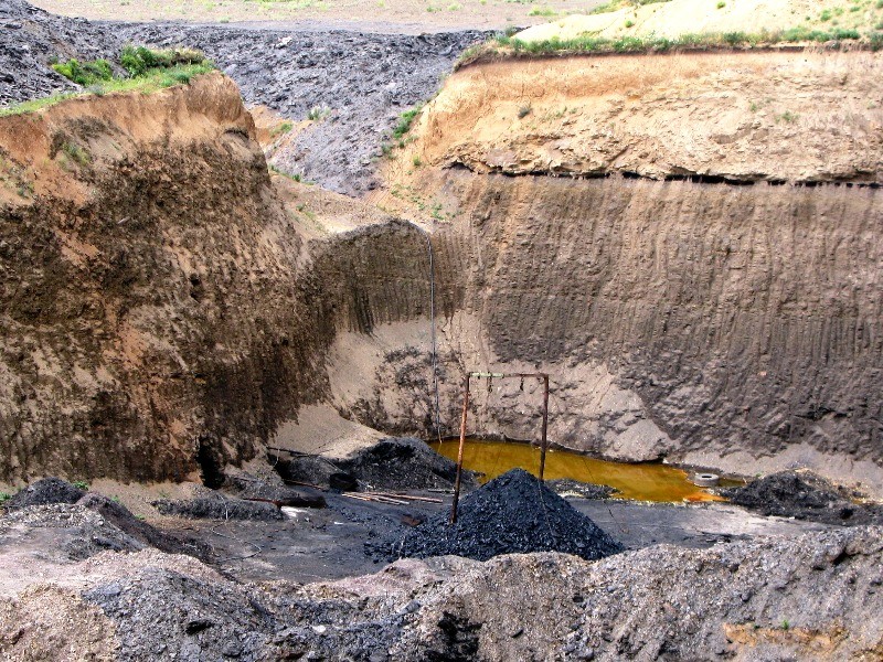 Dark Pits Large illegal pit in the forest near the town of Snezhnoe. The coal is loaded onto a track.