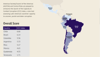 To measure how effectively countries can combat corruption, the third edition of the CCC index – put together annually by the Americas Society / Council of the Americas (AS/COA) and Control Risks – examined legal capacity, democracy and political institutions and civil society and media responses.