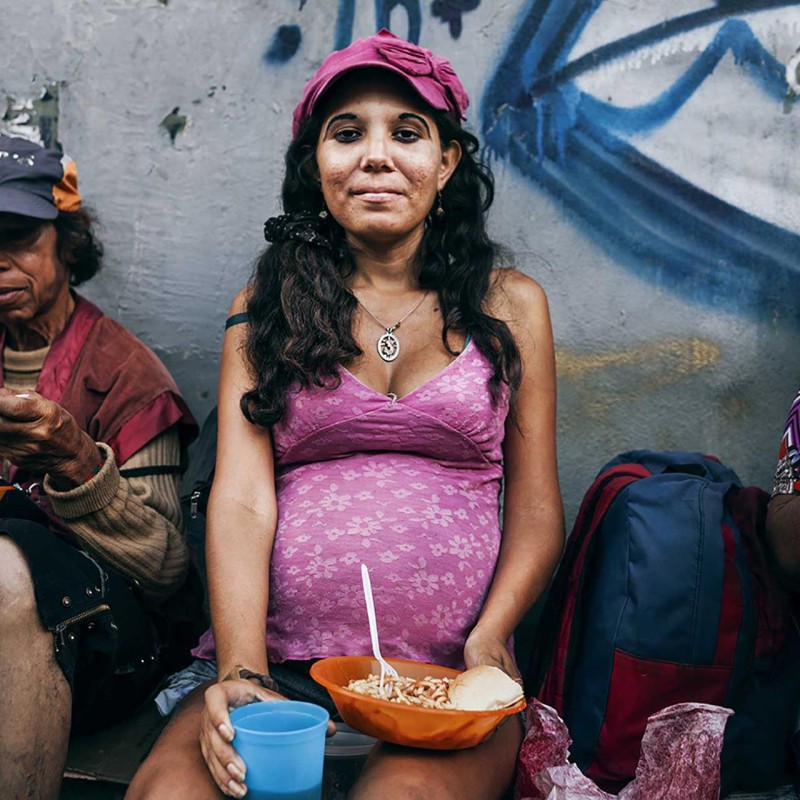 She is one of the 200 people that come every Sunday to Sabana Grande Boulevard to get food from the Jesus Camino Truth and Life Foundation. Her name is Yoanna Flores, and she is 24 years old and eight-months pregnant.