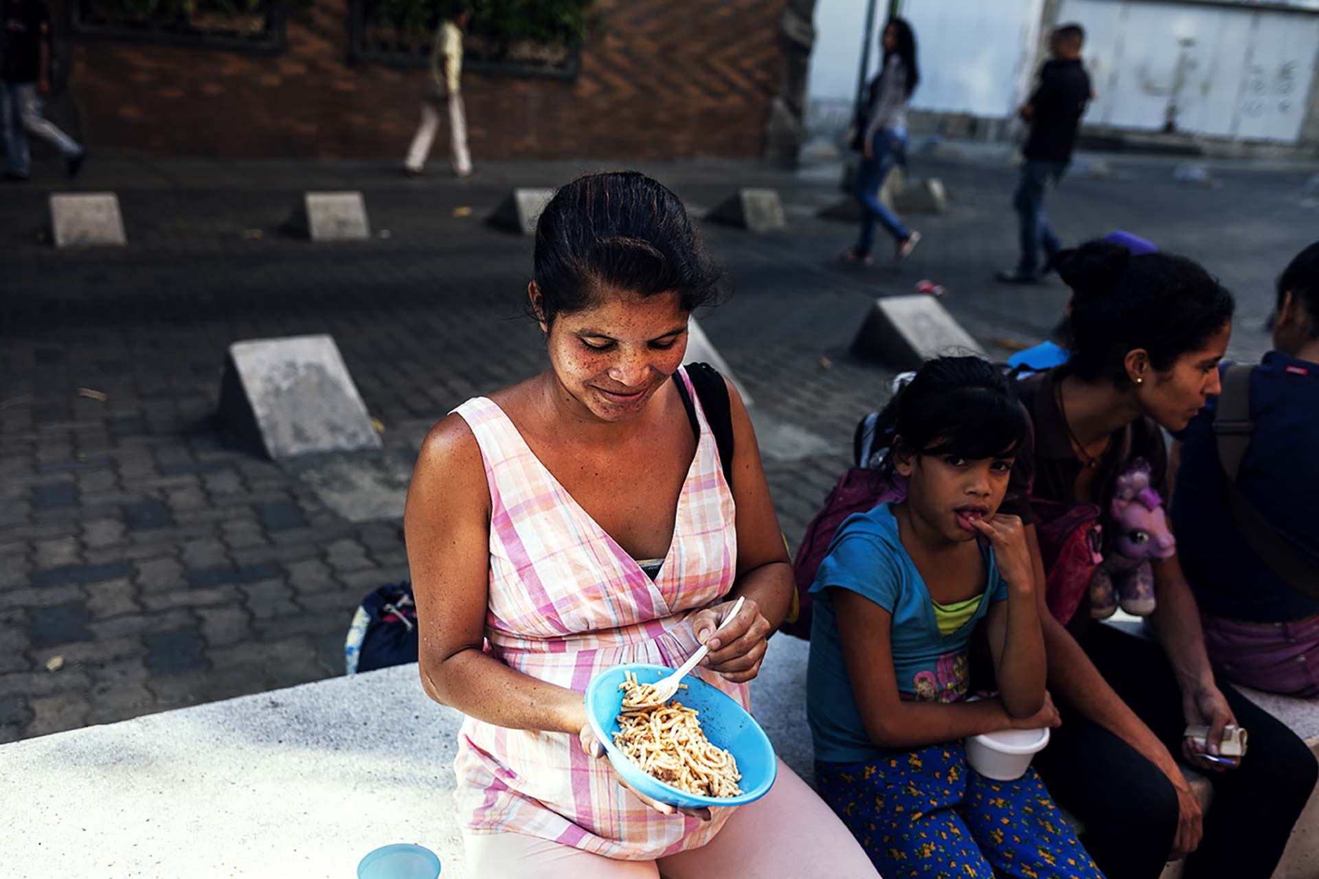 Three hours ago, she says, she left the shack where she lives in Caucaguita (almost 22 kilometers away) to take her place in the line that will ensure a plate of pasta, a piece of bread and half a glass of tea.