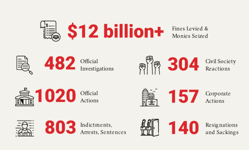 OCCRP’s primary basis for measuring impact is increased accountability. We measure this in terms of illicitly acquired funds returned to the public sphere; civic actions, such as a protest calling for change; government actions, such as when a government seeks evidence from another government based on an investigation; corporate actions, such as when a financial institution closes a loophole in the banking system; resignations and sackings, like when a prime minister is forced to quit; official investigations, usually opened by a national prosecutor; and arrests, indictments, and sentences. Since we began recording impact in 2009, our investigations have contributed to: