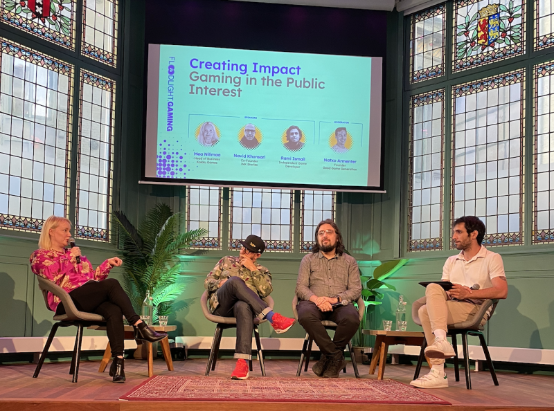 Top photo caption: Mea Nilimaa (Kokku Games), Navid Khonsari (iNK Stories), Rami Ismail (independent video game developer), and Natxo Armenter (Good Game Generation) on a panel at the inaugural Floodlight Investigative Journalism Gaming Summit.