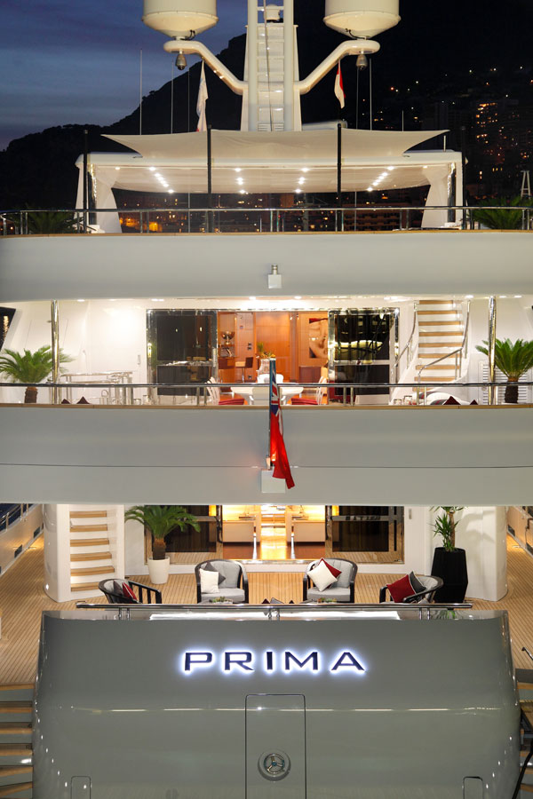 Its lavish interior accommodates 12 guests, and its common areas - all 350 square meters of them – are decorated with marble, leather and drapery. Prima reportedly “boasts an exquisite Italian character, with high-end furnishings throughout, and a well-chosen color palette,” according to sales literature.