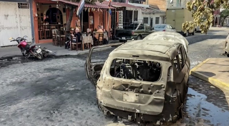 View of a burned vehicle in Guadalajara, Mexico on February 22, 2026.