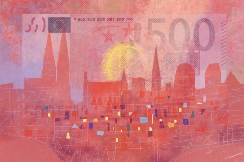 OpenLux was a straightforward series of stories about hiding wealth and the ultimate beneficial owners of companies registered in Luxembourg. Paul Klee’s painting “Castle and Sun” (lower right) was the inspiration for these illustrations. The lines in the painting reminded me of stained glass windows in older European houses and the red colors made me think of the saying, “Money is the lifeblood of the economy.” I used both of these things for the Luxembourg skyline, which became the theme in each image. I then added elements from a country’s currency, depending on the location for each OCCRP story. Paper money usually portrays the most powerful symbols of each country, so a bird, ship, animal, or portrait cuts across the Luxembourg skyline to match the narrative of the story. The design of €500 becomes the “sky” and the “earth” in this world of money.