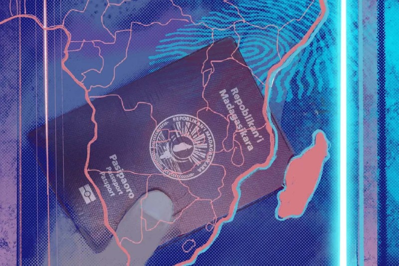 Building the images for the Semlex series reminded me of cooking with different ingredients. The series is about a Belgium-based biometrics company that used bribes and kickbacks to get contracts around the world. For the background I used a door and kept adding images, layer by layer, until the door is unrecognizable but serves its purpose. The last layer contains the main symbols we want people to see — the fingerprint, the passport — almost like putting garnishes on top of a tart. The colors impart information; each color has an effect on the body and makes people feel something. The blue and red used here are meant to evoke a lifeless place where there is no sun and man is part of the machine, a cold environment.