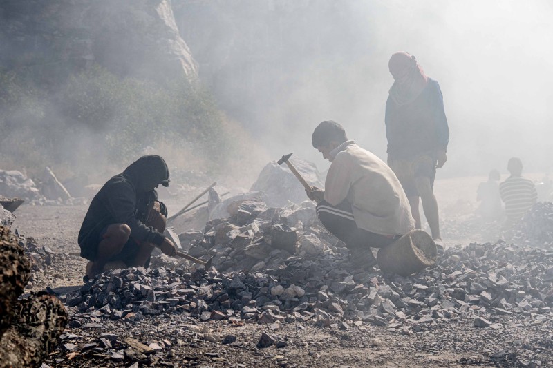 Their parents and grandparents also toil in the quarry, but for a full ten-hour day, six days a week. Instead of face masks, which cost too much, they wrap their mouths and noses with rags or old clothes to avoid inhaling the dust of the limestone kiln, which burns at 1,000 degrees and emits a constant, thick smoke that coats the entire area in white powder.