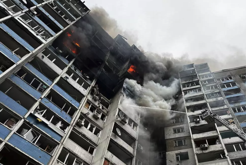 A residential building in Kyiv's Holosiivskyi District, damaged during Russian missile attack on the morning of February 7, 2024. Four residents were killed.