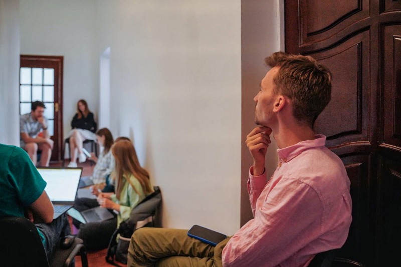 Journalists at Slidstvo.info hold an editorial meeting in a hallway during a Russian attack.