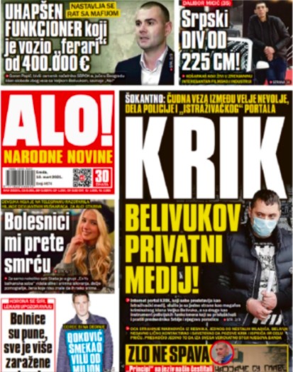 "KRIK - Belivuk's private media," reads the title on a front page of a Serbian tabloid, connecting the outlet to a well-known criminal. Other pro-government outlets reported in a similar manner. Credit: CRD Europe/Twitter