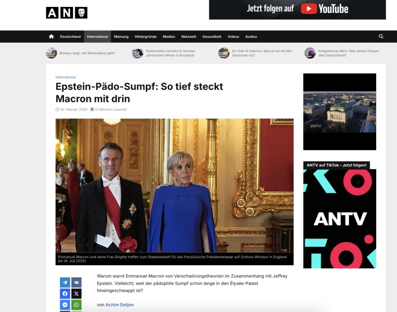 In February, a German-language website called Anonymous News — which has no connection to the famed hacktivist group with the same name — listed an “Achim Detjen” as the author of an article with a misleading headline that suggested French president Emmanuel Macron was linked to convicted sex offender Jeffrey Epstein.