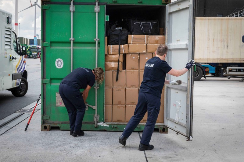 Customs presenting Antwerp port cocaine seizure results and container search methods with scanners and sniffer dogs.