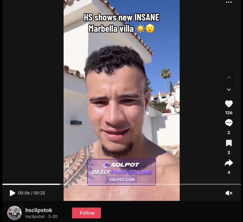 British influencer Harrison Sullivan in a video from a villa in Marbella.