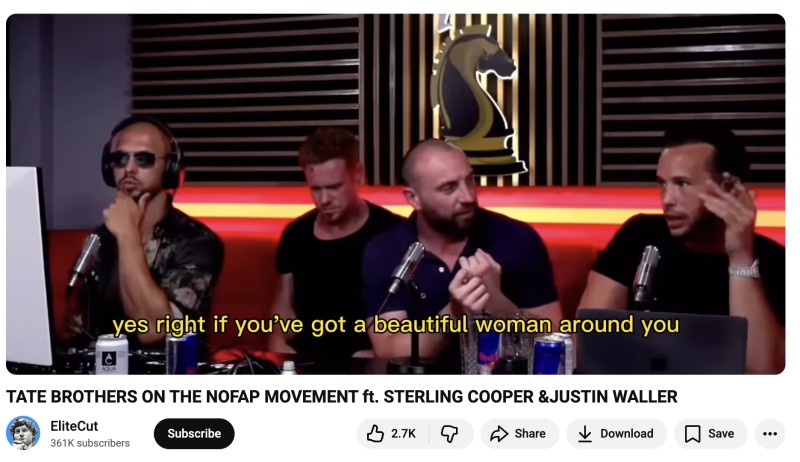 In an episode with Luke Barnatt, the two men shoot the breeze over how “high-value men” get sucked in by women and don’t set good enough standards when choosing a partner. Barnatt warns a relationship should not be with “some whore who’s going to take everything from you.” (He did not respond to a request for comment on whether he stood by this remark or believed it to be misogynistic).