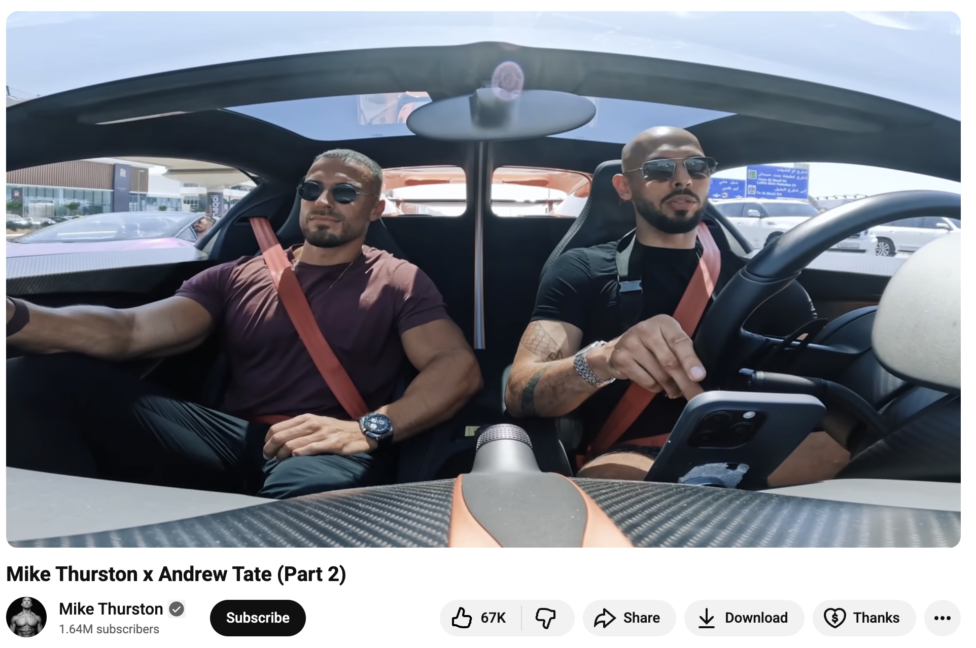 While his focus is fitness, Thurston has also hosted two viral video interviews with Andrew Tate, the second of which was posted in Dubai in early 2025. The interview takes place in Tate’s Bugatti and covers topics from Tate’s views on European politics to his response to the criminal allegations against him.