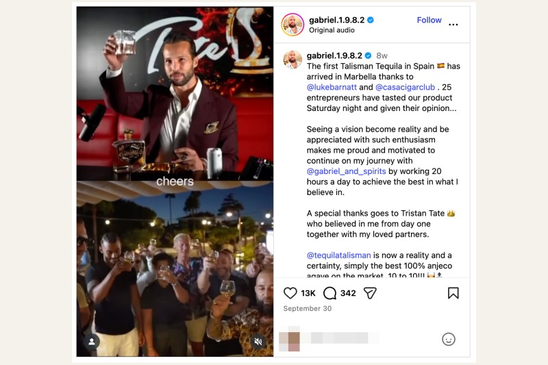 But this was billed as a particularly exclusive occasion: The guests had secured just 25 coveted spots at the first European tasting of Tristan Tate’s new tequila. Social media footage of the event shows Tate video-calling into the party, smiling in a burgundy suit, and inviting the attendees to join a toast.