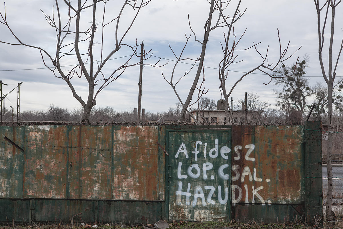 Graffiti in Budapest that reads 'Fidesz stealing, cheating, lying'. (Photo: FordC/Alamy Stock Photo)
