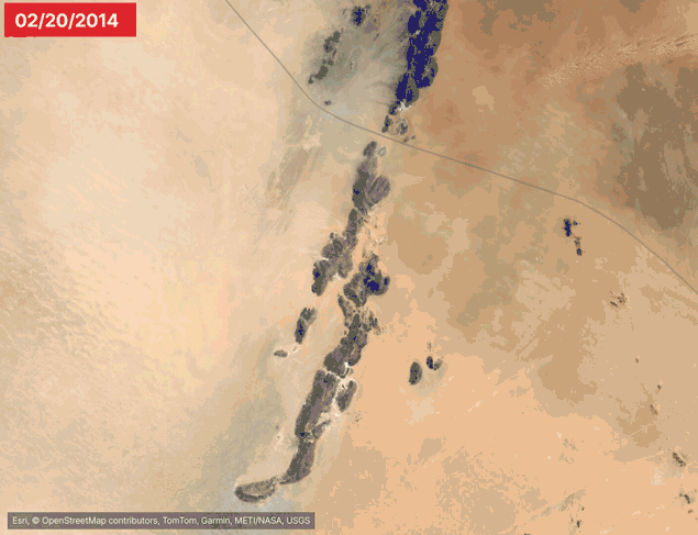 Satellite views of the Thaniyah mountain range in Marib province, Yemen, between 2014 and 2025, show the expansion of quarries.