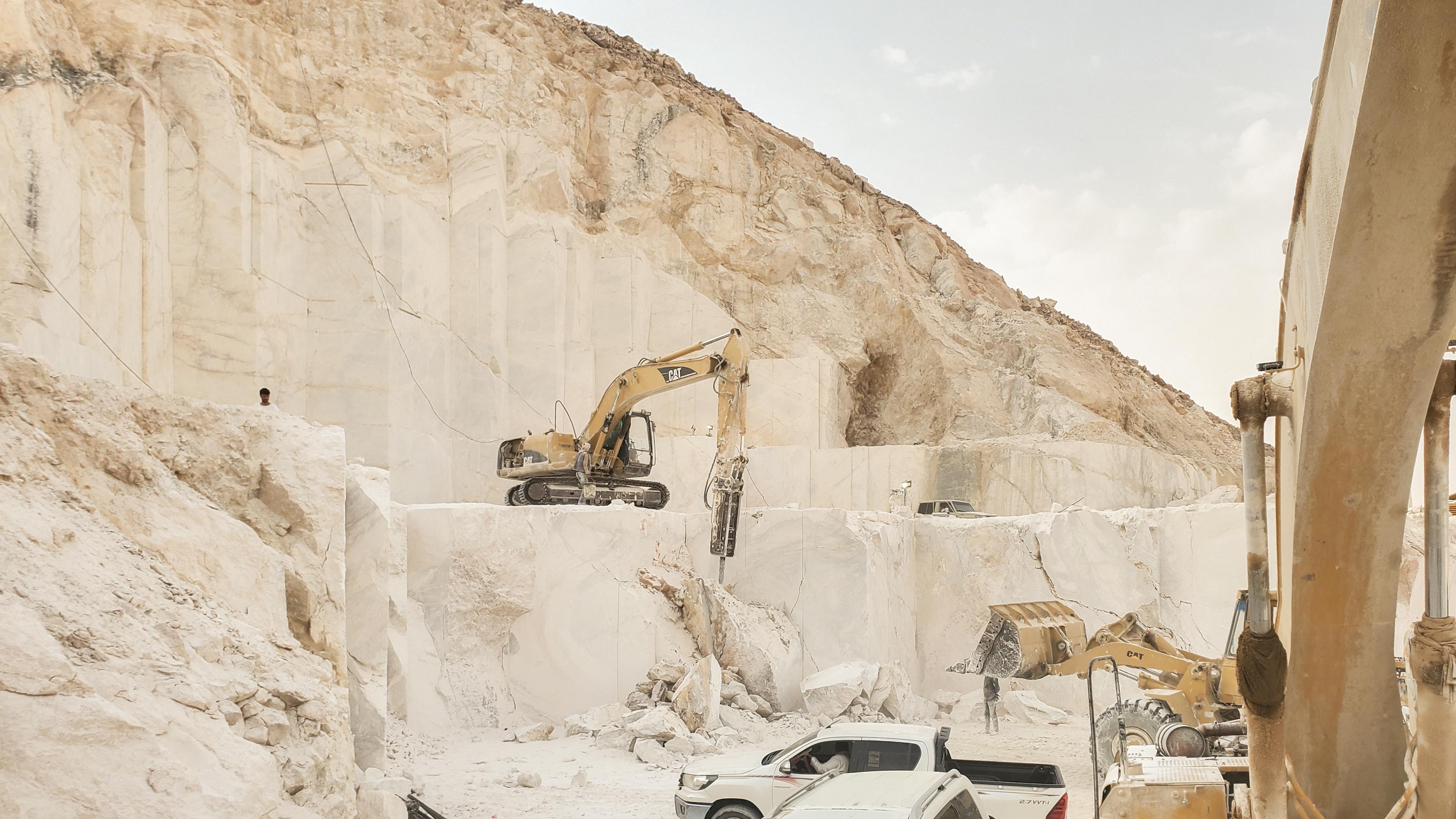 Heavy machinery extracting raw marble from the Thaniyah Mountain Range in Marib province, Yemen.
