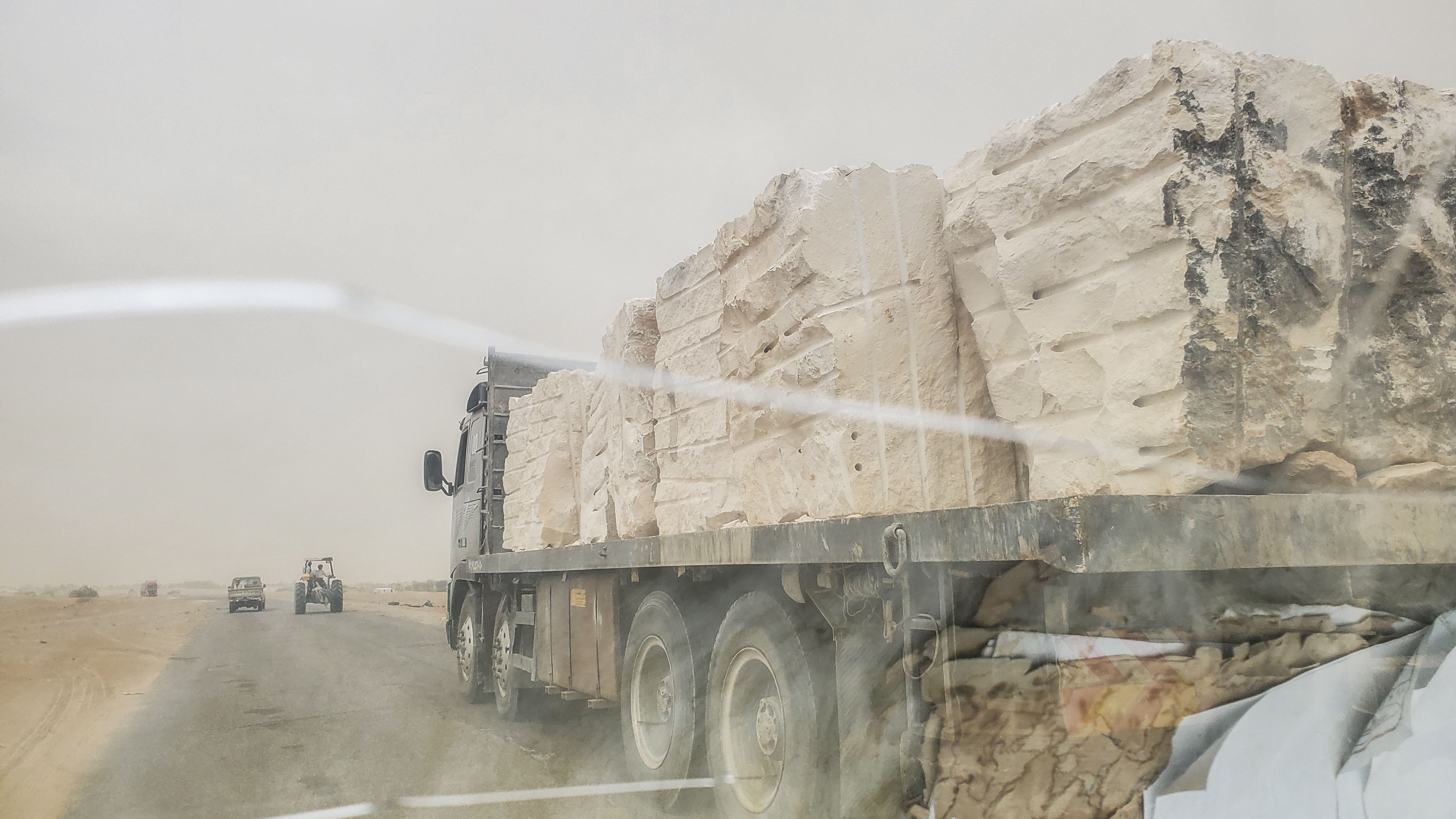 Marble is transported by truck in August 2025, destined for sale in the domestic market or in neighboring countries such as Saudi Arabia and Oman.