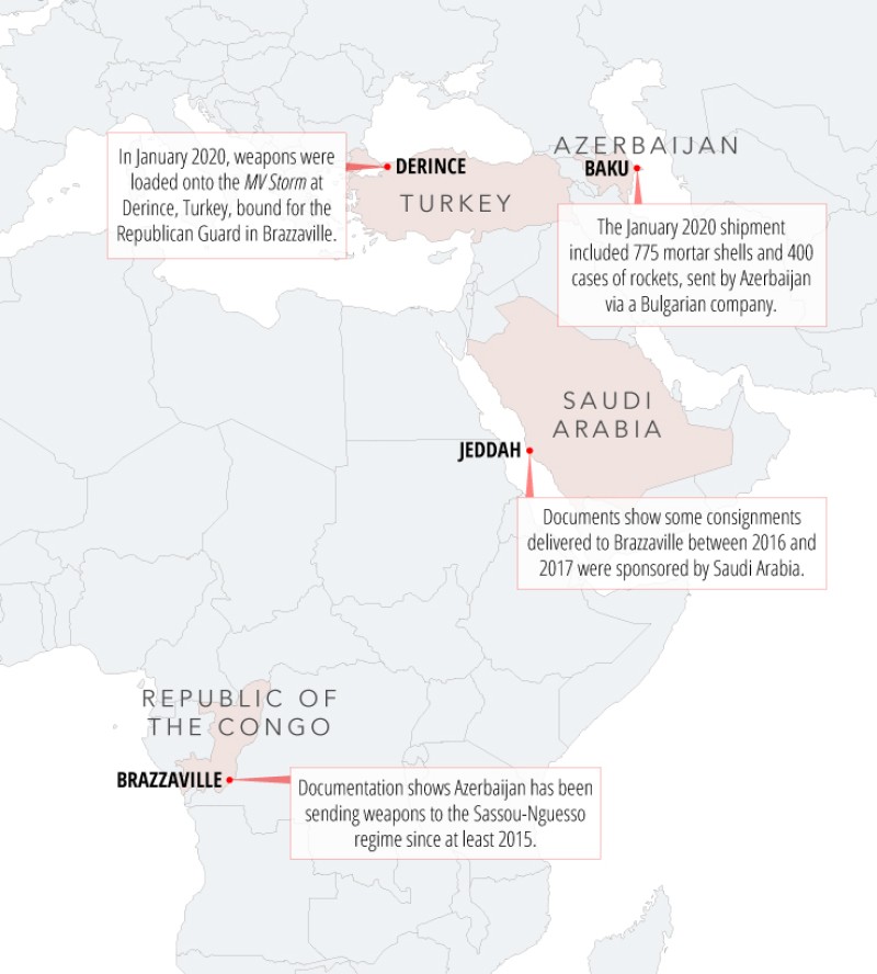 In January 2020, at the Turkish port of Derince on the eastern shores of the Sea of Marmara, a huge cache of weapons was loaded onto the MV Storm. Registered in the tax haven of Vanuatu, the ship set sail with an arsenal of mortar shells, multiple launch rockets, and explosives, en route from Azerbaijan to the Republic of the Congo, better known as Congo-Brazzaville.