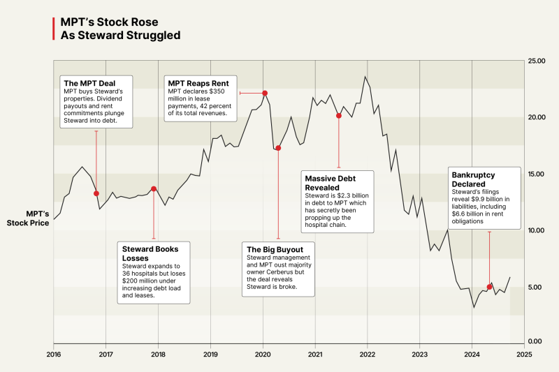 On the face of it, the deal looked advantageous to both sides. Steward would earn a windfall of $1.2 billion, a valuable cash injection for a hospital business operating on slim margins. MPT would expand its property portfolio and acquire an amenable new tenant to pay high rents, helping lure investors to pay a premium price for its shares just ahead of the deal.