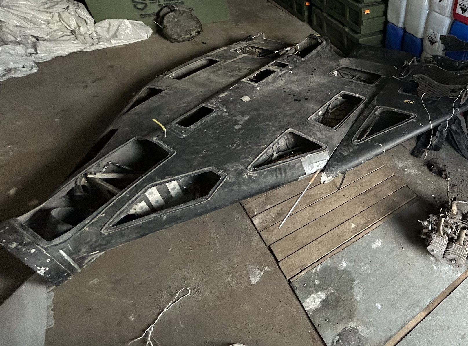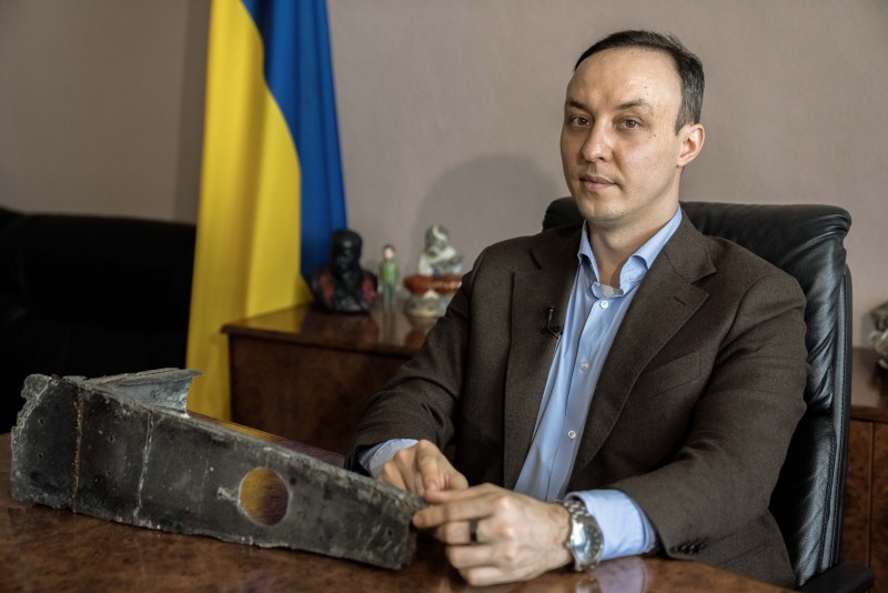 Vladyslav Vlasiuk, the Ukrainian President’s Commissioner for Sanctions Policy, showing a part of the fuselage of a recovered Geran-2 drone.