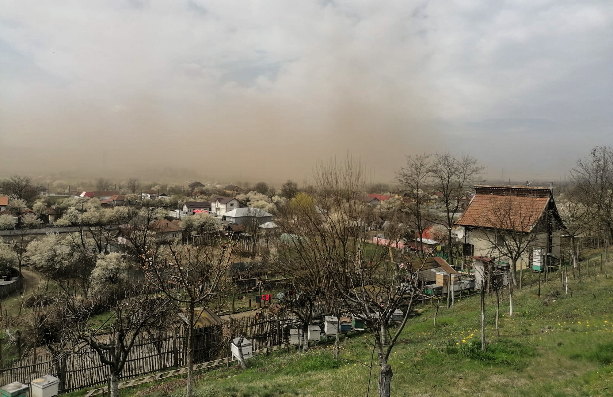 View of a dust storm near Brăcaci Gâjiu’s home, with an Oltenia lignite plant in the background.