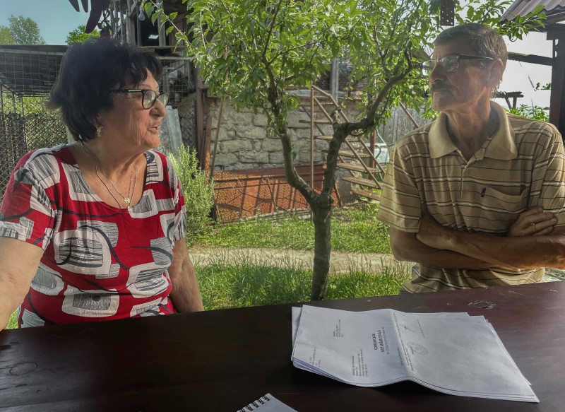 Lung doctor Brăcaci Gâjiu and her husband with a copy of the court document they filed against Oltenia, requiring the company to reduce ash pollution, a case they won.