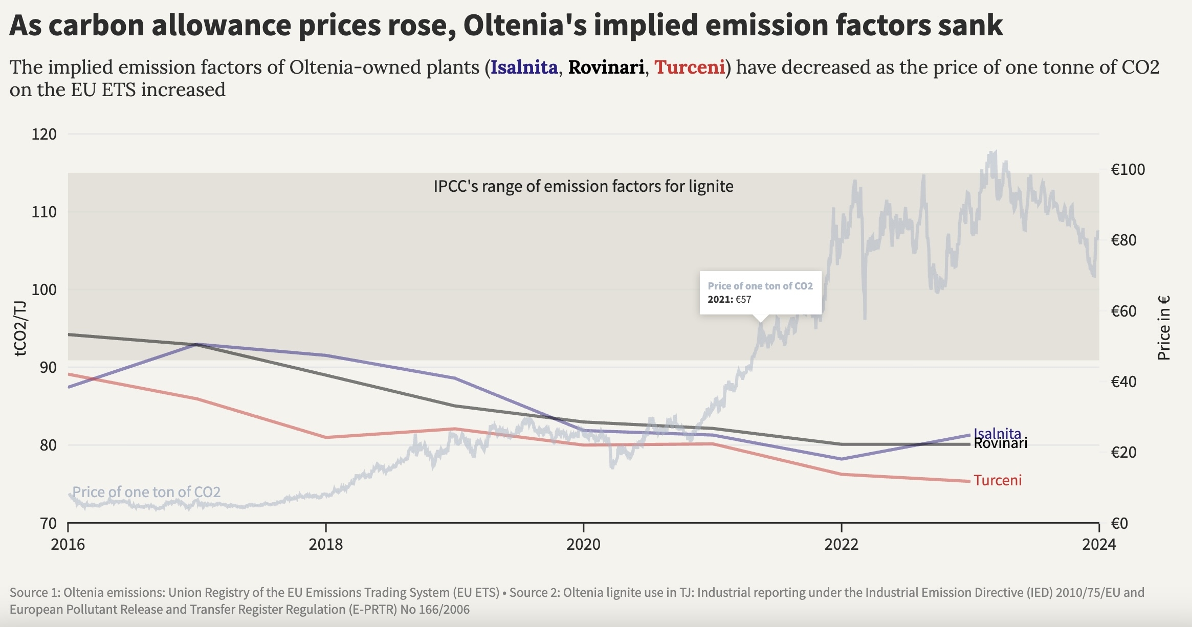 According to OCCRP’s estimates, the implied emission factors used by the company’s Rovinari and Turceni plants later decreased by approximately 15 percent between 2016 and 2023. During the same period, the price of carbon allowances increased to almost 90 euros per tonne.