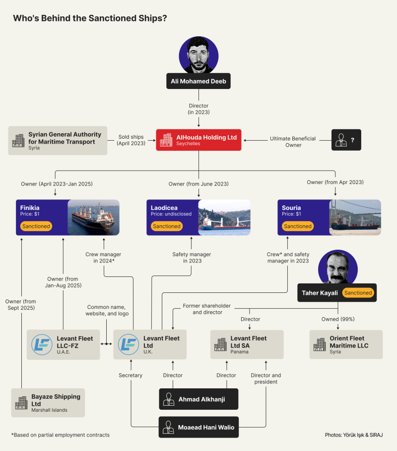 The U.K.-based Levant Fleet has served as the safety manager for the Laodicea and the Souria since 2023, according to the shipping database Equasis, and as a crew manager for the Souria and the Finikia in 2024, according to partial employment contracts obtained by SIRAJ.