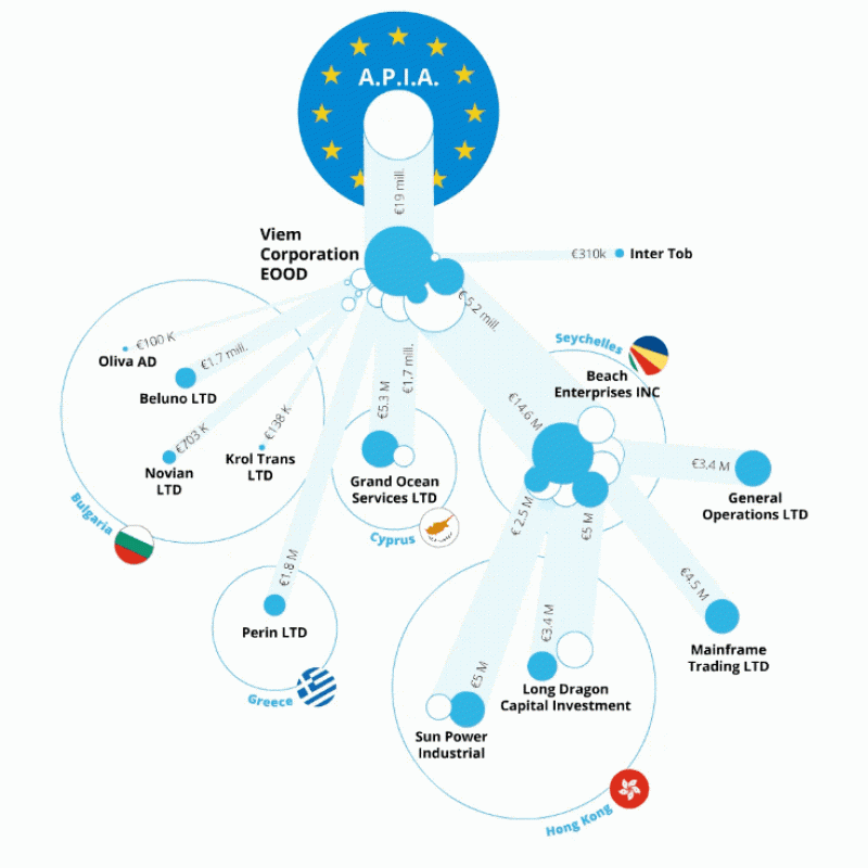 Unbeknownst to the EU, Viem was controlled by two alleged organized crime figures from Bulgaria. Leaked bank records show that in a single day in October 2012, Viem stole 19 million euros intended for the food aid program. The cash was then funnelled through a network of offshore companies that moved funds from Cyprus, around the world, and back to Europe.
