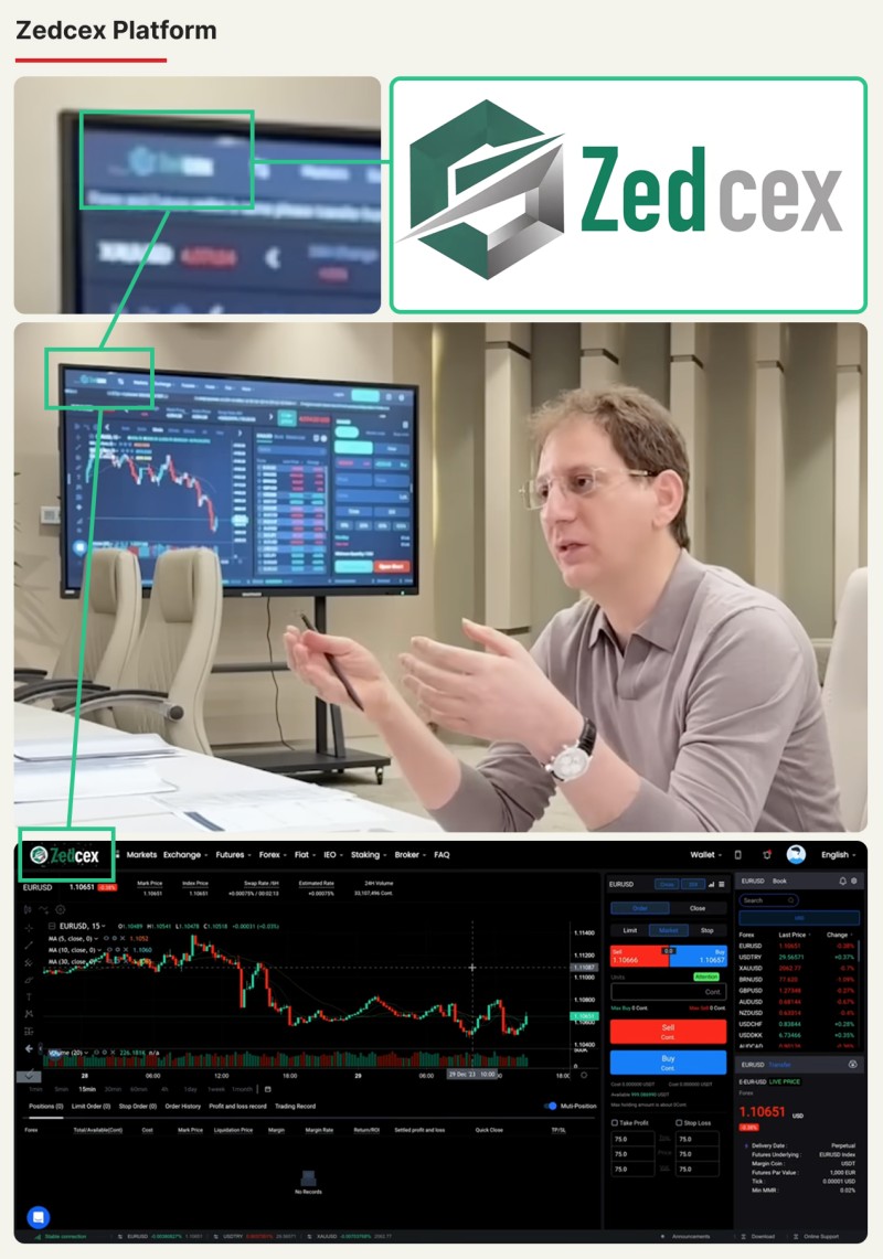 A still from a YouTube video Zanjani shared, showing himself sitting in an office in front of a television showing the Zedcex trading platform.