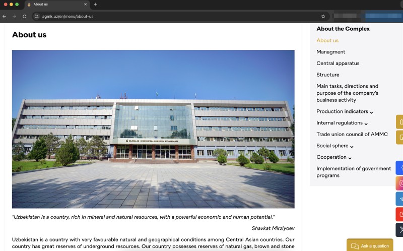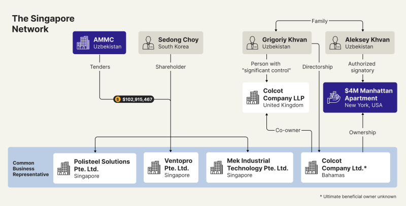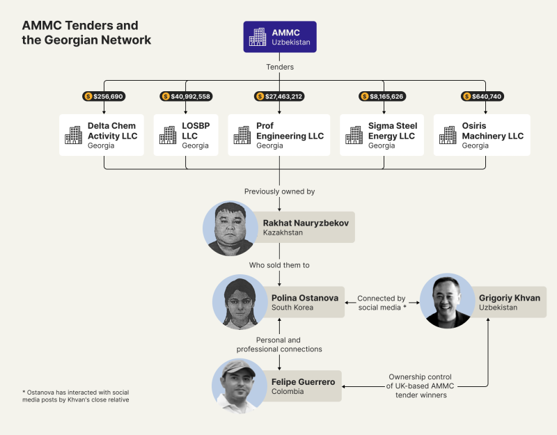 But an investigation by OCCRP has found that the two U.K. firms are part of a larger circle of companies stretching from Singapore to the South Caucasus that were awarded more than $200 million in Uzbek state contracts since 2022. The client is Almalyk Mining-Metallurgical Complex (AMMC), a state enterprise that Uzbek President Shavkat Mirziyoyev has slated for a possible initial public offering on a foreign stock exchange.