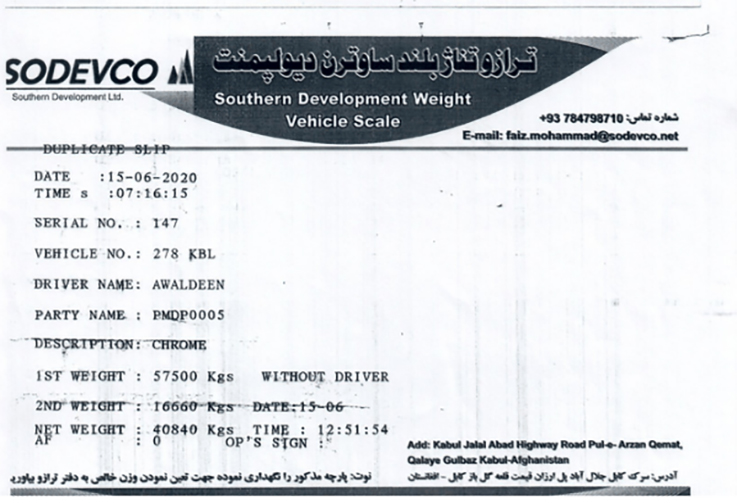 Two auditor reports published on the mining ministry website, however, confirmed that at least 1,200 short tons of the mineral was shipped to Southern Development in the first half of 2020. The supplies came from the Maidan Wardak, Khost, and Paktia provinces — the same regions where the 20,000 tons of chromite confiscated by the government was stored.