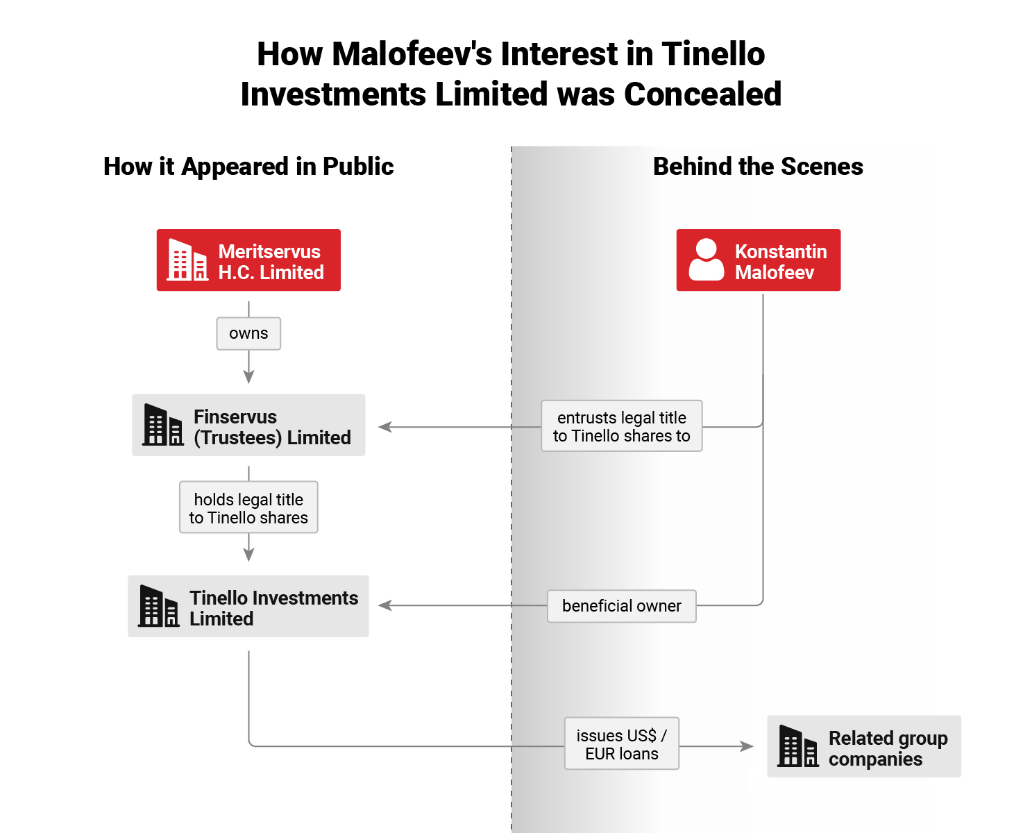 In 2005, Malofeev, then an up-and-coming 30-year-old businessman, set up a company through MeritServus called Tinello Investments Limited. He also signed an agreement with FinServus, a MeritServus subsidiary, to operate Tinello on his behalf.
