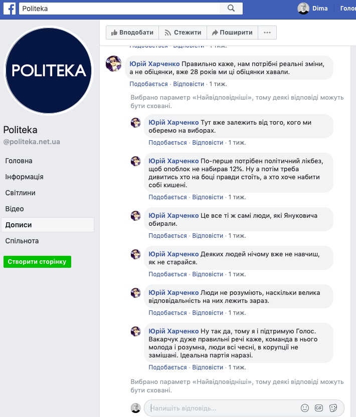 During a month and a half on the job, the Slidstvo.Info reporter discovered that these social media techniques were used even on behalf of progressive politicians who publicly spoke out against such tactics. For example, the troll farm supported Sviatoslav Vakarchuk, a popular musician whose reformist Holos party now holds 20 seats in parliament.