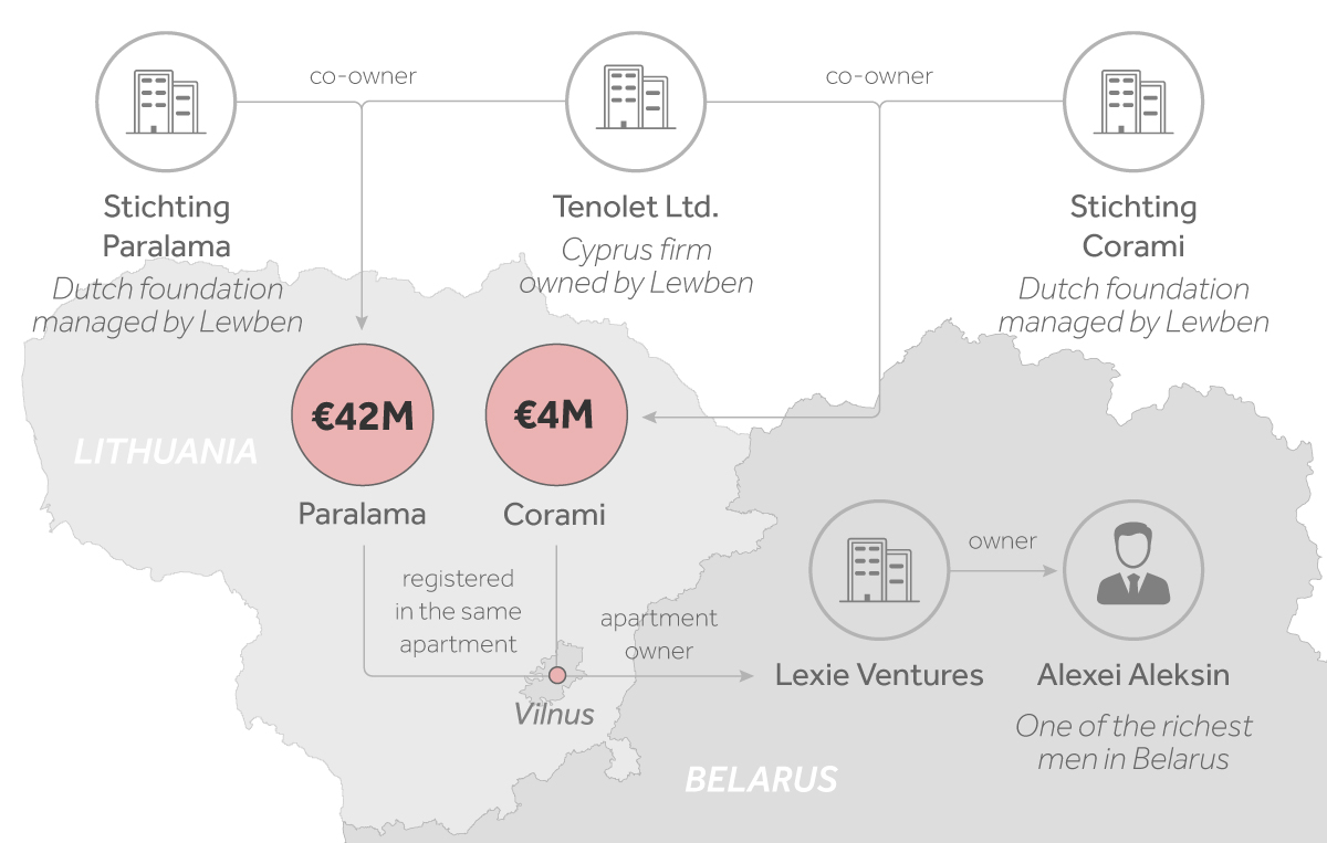 The two companies that moved $46 million into Lithuania, named Paralama and Corami, were registered on the same day in 2013 at the Vilnius flat purchased by Lexie Ventures, Aleksin’s consulting firm “based” in the ruined building.