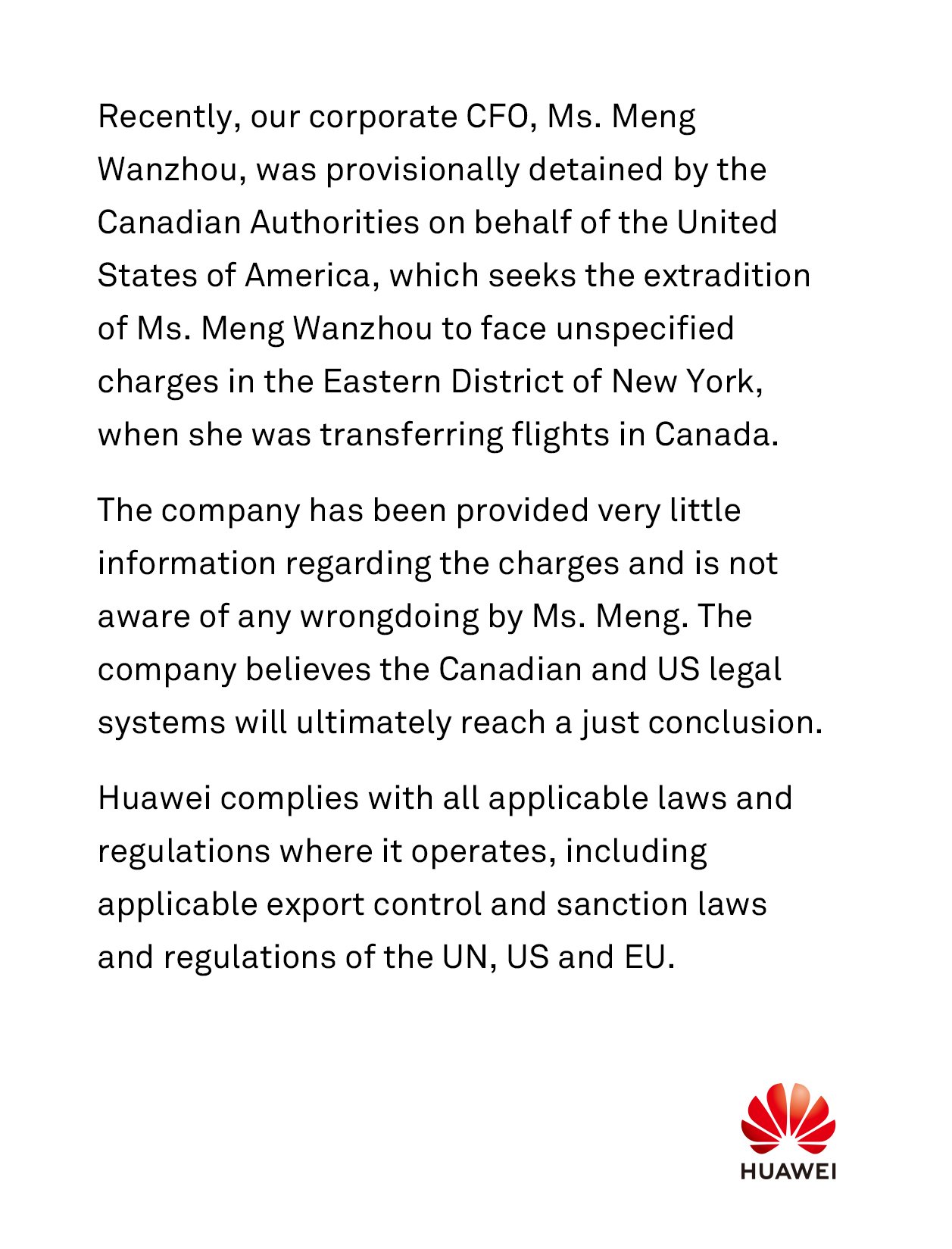 “The company has been provided very little information regarding the charges and is not aware of any wrongdoing by Ms. Meng,” the statement said. “The company believes the Canadian and US legal systems will ultimately reach a just conclusion.”