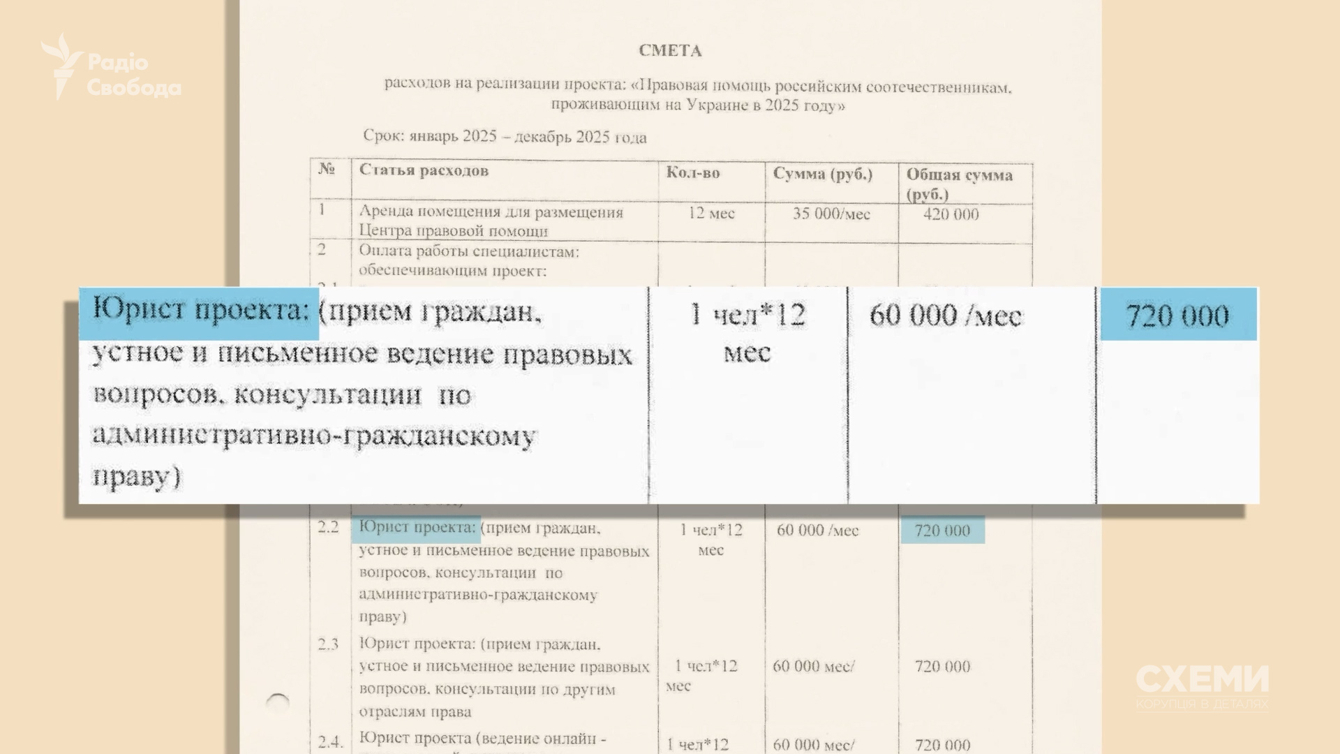 A 2025 funding request, found in the leaked Pravfond emails and signed by Baklanov, sought over 3 million rubles ($37,200 USD) for “legal aid to compatriots in Ukraine.” Lawyers were slated to receive 720,000 rubles each (roughly $8,800) for preparing reports for Russia’s parliament and Foreign Ministry about rights abuses against people living in Ukraine. The money was also allocated to public consultations with Russian-speakers in Ukraine, and for handling legal matters.