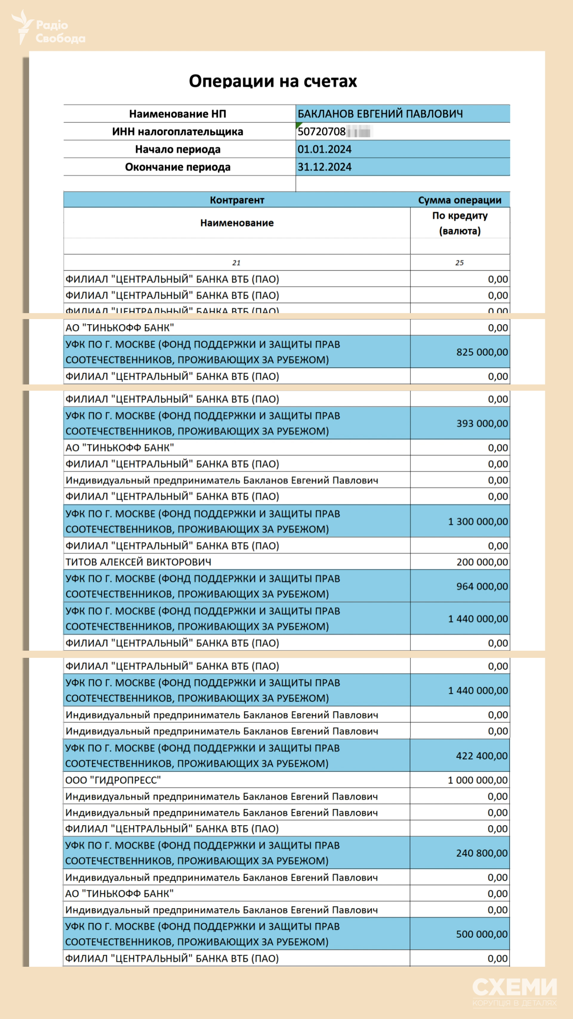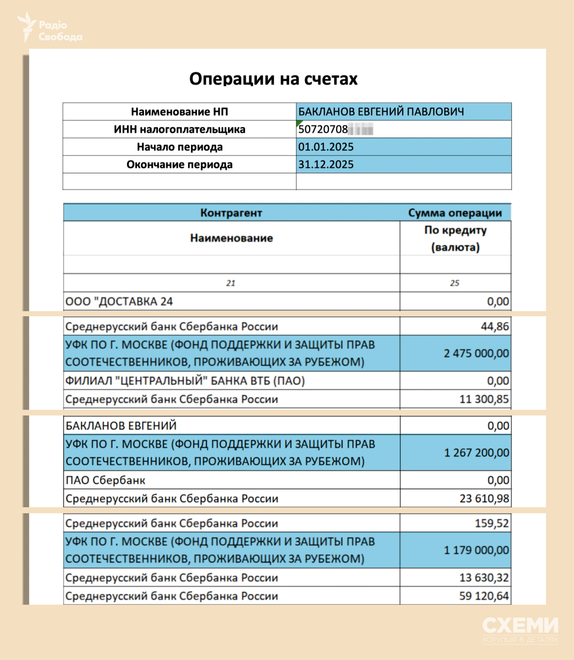 Bank records obtained by Schemes show Baklanov received three tranches this year totaling nearly 5 million rubles ($53,900), and 7.5 million rubles ($80,900) in 2024.