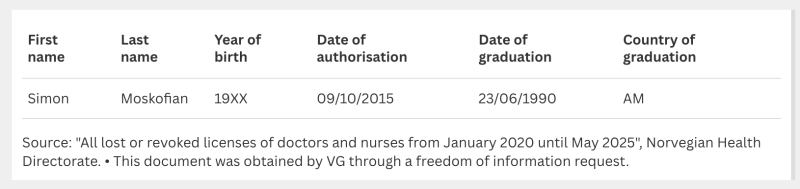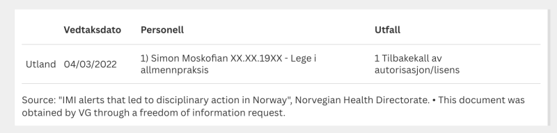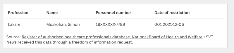 That Moskofian’s license was indeed revoked in Sweden and Norway for substantial reasons. Reporters filed a freedom-for-information request to get documents from the health authorities to confirm this.