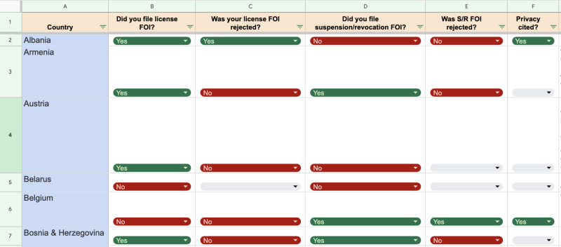 In countries where this wasn’t possible — either because data on doctors was completely unavailable online, or because it was impossible to scrape — reporters filed freedom-of-information requests to obtain it. Our group made a huge coordinated effort and filed around 20 requests in countries around Europe. Authorities in 17 countries, including Sweden, Norway, Denmark, and Finland, ended up providing journalists with data sets of licensed doctors, and those whose licenses had been revoked or suspended.