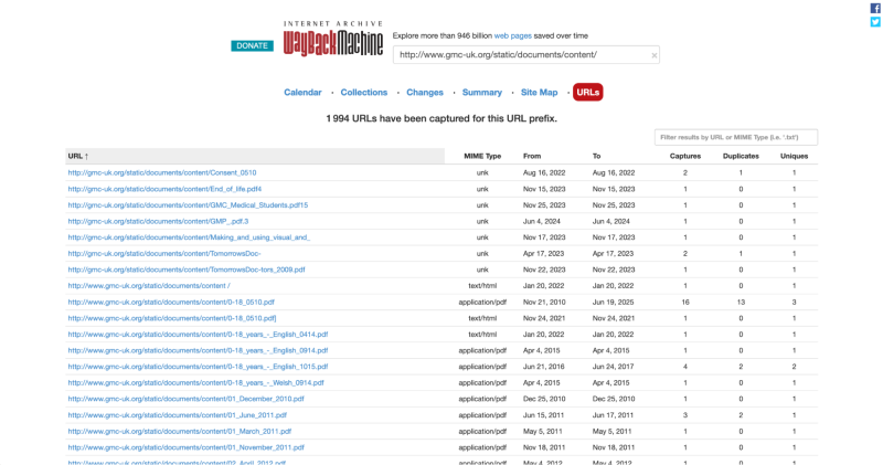 In the U.K., decisions older than 10 years are deleted from the GMC’s website. Reporters tried to obtain such decisions through freedom-of-information requests, but these were rejected. We found a workaround using the Wayback Machine, a tool used to archive previous versions of websites, where we could find all documents previously uploaded by the GMC.