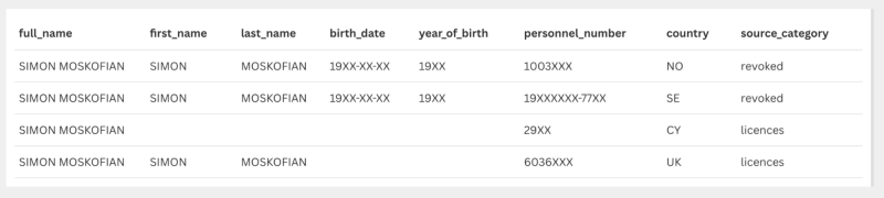 He came onto our radar after we queried our database for a full_name that appears in at least two different countries, both in a “revoked” dataset and in a “licensed” dataset.