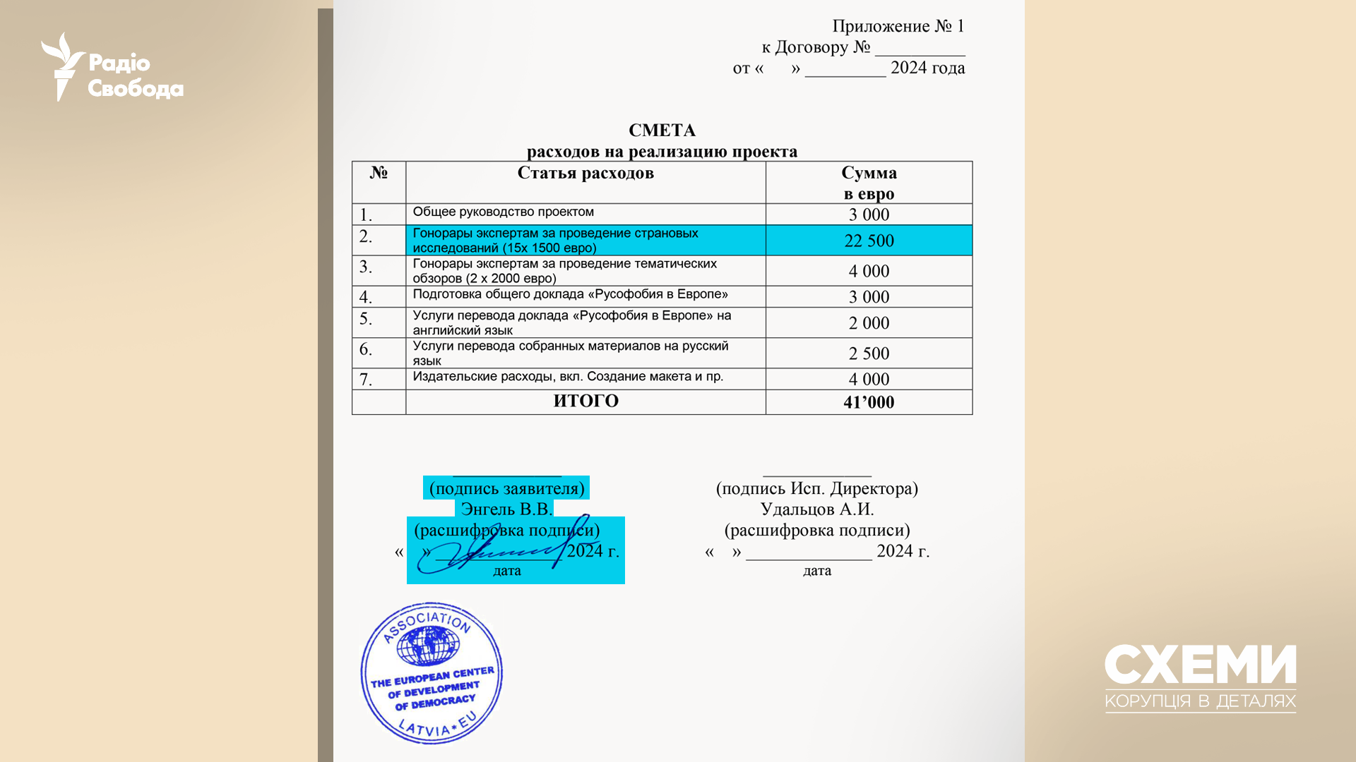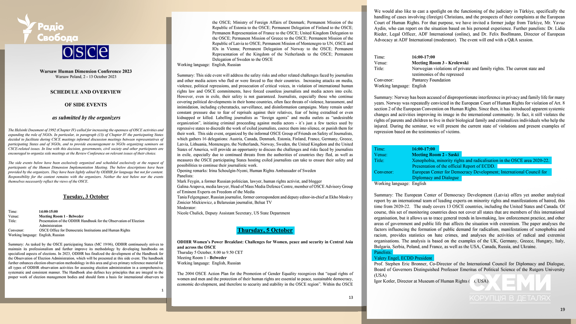 A month before the 2023 OSCE event, Engel emailed Pravfond a signed request for 1,230 euros to organize a presentation of his report on the sidelines of the conference, plus funding for airfare from Riga to Warsaw and back, hotel accommodation, and a 50-euro per diem.