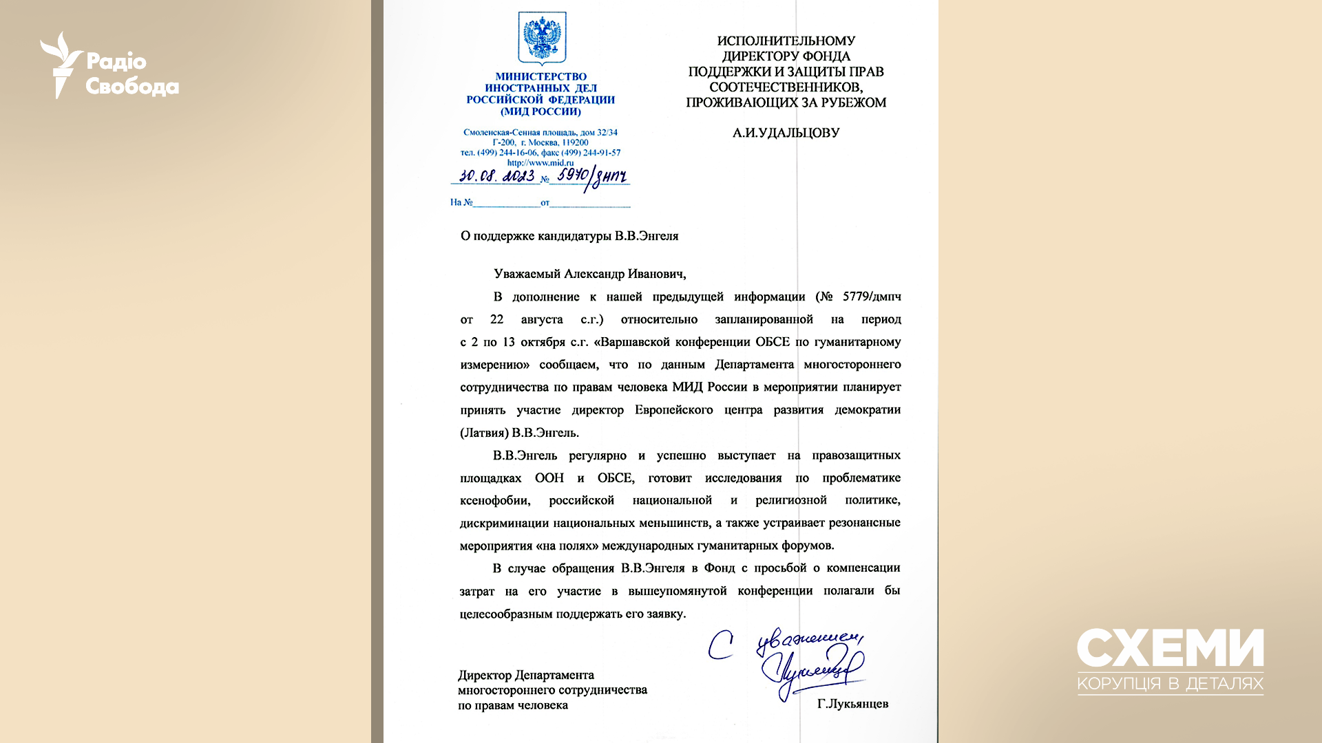 The same day, September 1, 2023, Russia’s Ministry of Foreign Affairs sent an official, signed letter of support for Engel’s application, describing him as a successful researcher and speaker at international venues, and an organizer of “high-profile events on the sidelines of international humanitarian forums.”
