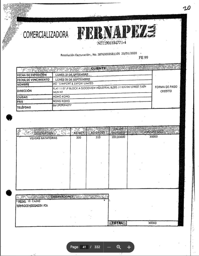 Customs data shows that 36 out of 53 total fish bladder shipments from Fernapez to Ho’S Import & Export from 2019 to 2021 were valued at $30,000, despite the fact that their weights varied considerably and their shipping codes indicated they were the same product.