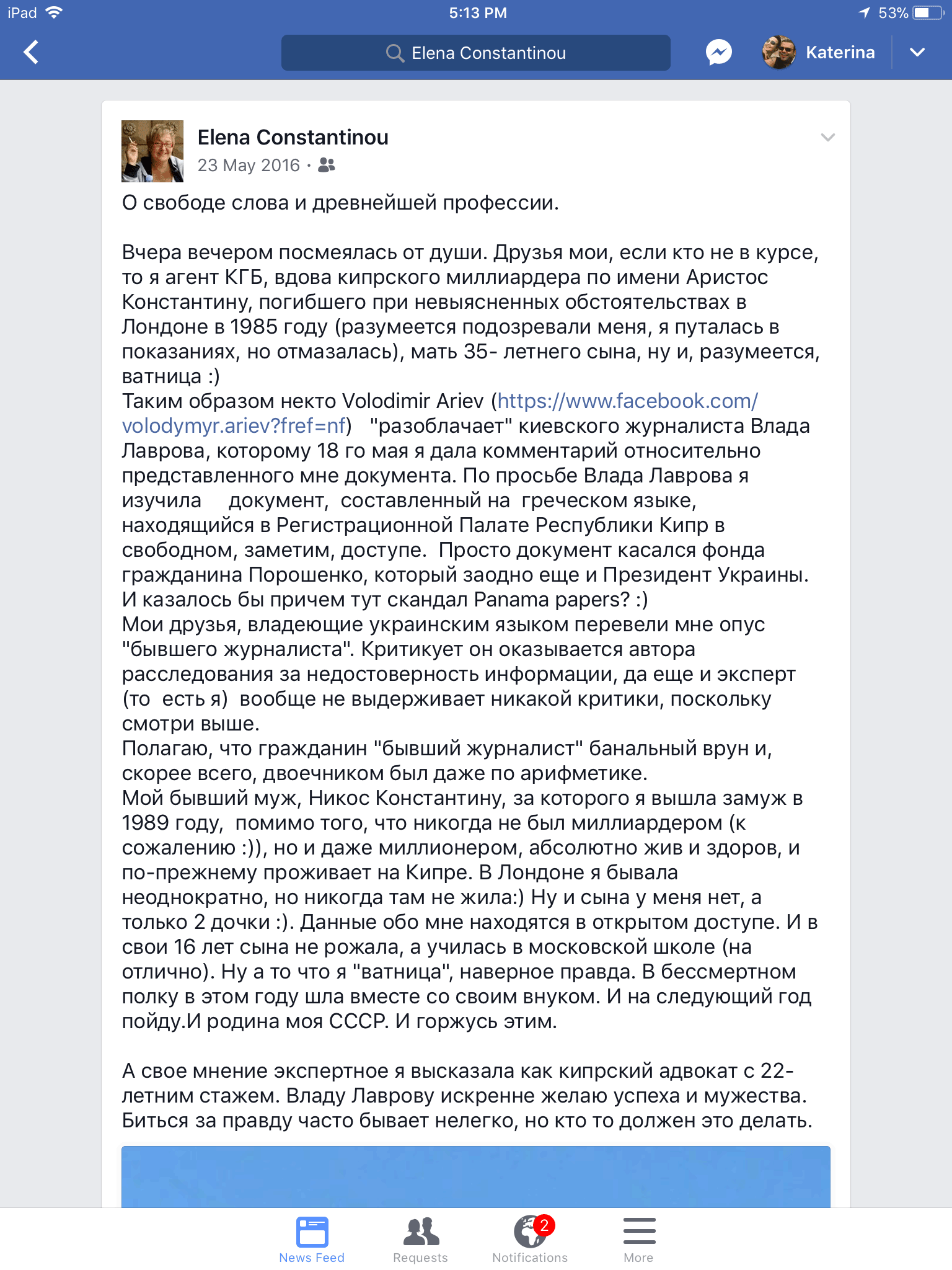 “My former husband, Nikos Constantinou, has never been a billionaire (unfortunately) [or] even a millionaire and is still alive and healthy living in Cyprus,” she wrote. Constantinou confirmed her pro-Russian sentiments, but said her comment to OCCRP was as a “Cyprus lawyer with 22 years of experience.”